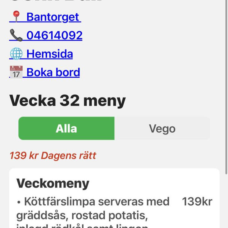 1. Öppna appen2. Se menyer för varje veckodag3. Välj restaurang & maträtt4. Navigera, ring, boka – direkt i appen